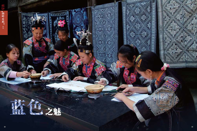 蠟染是貴州省丹寨縣、安順縣、織金縣苗族世代傳承的傳統技藝。 丹寨縣、安順縣及織金縣是以苗族為主體的多民族聚居區,在長期與外界隔絕的艱苦環境中,這里的居民逐漸形成了自給自足的生活方式,古老的蠟染技藝因此得以保留下來。按苗族習俗,所有的女性都有義務傳承蠟染技藝,每位母親都必須教會自己的女兒制作蠟染。所以苗族女性自幼便學習這一技藝,她們自己栽靛植棉、紡紗織布、畫蠟挑秀、浸染剪裁,代代傳承。在此狀況下,這些苗族聚居區形成了以蠟染藝術為主導的衣飾裝束(以上三照片由劉軍提供)。