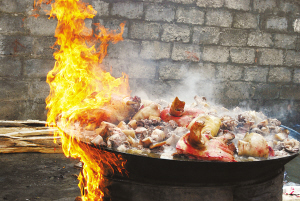 辦酒席的那天一早,幫忙的人都把自己砍肉的工具拿來,幾個人一組,有的拉豬腳,有的抓豬尾巴,把買來的所有豬、羊全部宰殺好后,再砍成拳頭般大小的坨坨肉。待時間差不多了,安起幾口大鍋,將砍好的豬肉和羊肉用冷水洗干凈后,分別倒進鍋里煮。煮時不能爛燉,而要看火候,火候一到即熟,火候不到則夾生。肉煮熟后要馬上撈起來,裝在簸箕或大盆子里面,然后趁熱撒上適量的鹽巴和干海椒面,不停地攪拌。此外,不下任何佐料,以保證坨坨肉原汁原味。最后,按客人多少,把坨坨肉肥廋搭配著放在盆子里。