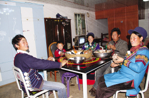用上裝飾著彝族傳統紋飾的餐桌和板凳,開心地吃起坨坨肉。俄底爾以攝