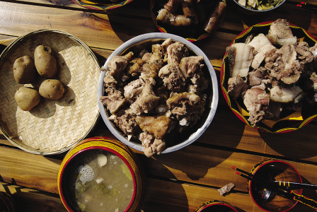 彝家人過年除了吃坨坨肉外,大多還要吃雞肉。這一天,家家桌上肉多多,素菜一般僅有一盆酸菜湯,這是解油去膩的美味。