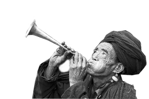在隆重悲痛的喪禮中,所吹的是拴有白布的大號嗩吶。調子低沉哀怨,像是一曲“喊魂曲”,應和著親人的悲鳴與哭泣,呼喊著逝去的親人回來。待到黑色的棺木被八個人抬往墓地時,大號嗩吶一路在前帶隊,遇水逢橋必吹,像是在開路,又像在引導亡魂歸來。下葬時,大號嗩吶聲一直不間斷地吹響,直到一座新墳立起,才算是完成告別儀式。大號嗩吶聲的停歇,從某種程度上代表著家人已經盡孝了。