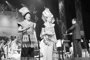 廣西戲劇院成立一年來,承擔起壯劇、桂劇、彩調劇3個國家級非物質文化遺產劇目和京劇國粹藝術的傳承、保護、發展重任,不斷推出具有“美麗廣西、壯鄉風格、時代特征、和諧兼容”的舞臺藝術精品,此次推出的《壯族詩情》便是其中之一。《壯族詩情》共分“地鼓”、“天歌”、“水秀”、“山雄”4個章節,以150多名演職員的演出陣容,通過合唱、獨唱以及民族器樂演奏的形式,如詩如畫地描述了廣西壯族的風土人情,突出了“美麗廣西”時代主旋律。圖為《壯族詩情》演出現場。