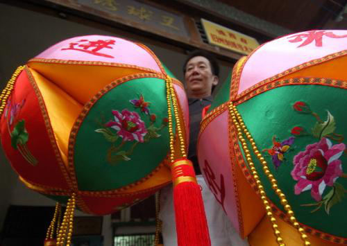 壯族繡球的制作工藝流程主要有:漿布——球面貼面——球瓣剪裁——球面描圖——球面刺繡——球瓣對折縫合——球瓣填充——縫合球瓣——球瓣合成——成品裝飾。靖西繡球的美主要體現在造型結構、刺繡紋樣和色彩組合上。其造型結構特征體現了豐富的形式美感,一是形體的融合統一,二是整體的對稱均衡。其刺繡紋案體現了精湛的手工技藝,如傳統紋飾只要為動物紋和植物紋兩類,動物紋只要有龍、鳳、鴛鴦、喜鵲、仙鶴、蝴蝶、魚等,植物紋主要有梅、蘭、竹、菊、松樹、牡丹、水仙、荷花等,另外也有人物繡,如八仙過海等。繡球 的精美炫目,跟大膽豐富的色彩組合有很大關系,靖西繡球強調色相強有力的對比張力和視覺刺激性,用高純度的色相進行強烈對比,凸顯了極富裝飾性而又高度和諧統一的色彩搭配原則。