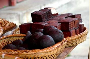 逢年過節或來了至親好友、土家人的餐桌上往往會擺上一碗血豆腐。血豆腐是土家族傳統菜。用新鮮的豆腐加上干凈的豬血,拌以食鹽、辣椒、花椒、桔皮、肥肉末,用手捏成塊狀,放在柴草煙上熏烤,以表面稍黑,內質稍硬為度。食用時可以切成薄片,加以豬肉爆炒,也可以切成細絲,加上辣椒、香蔥炒制。入口時,令人覺得清香酥軟,大開胃口,是一道下酒佐食的佳肴。