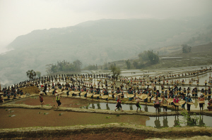 2009年3月1日,“中國紅河·元陽2009年哈尼梯田文化旅游節”在被譽為“梯田之鄉”的云南元陽縣開幕。作為此次旅游節主體之一的大型高原稻作農耕文化千人田野實景表演——《哈尼梯田》在此間隆重上演。在《哈尼梯田》中,哈尼人一直賴以生產、生活的田野——梯田,成了一個宏大的舞臺,不僅展示著哈尼族的歷史和現在,更成了少數民族群眾情感表達的載體。