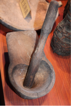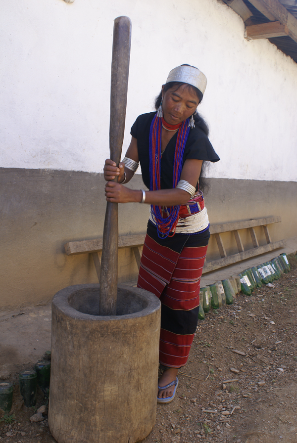 佤族以大米為主食。西盟地區的佤族都喜歡把菜、鹽、米一鍋煮成較稠的爛飯。其他地區的佤族則多吃干飯。農忙時日食三餐,平時吃二餐。雞肉粥如茶花稀飯是家常食品的上品。旱稻多現吃現舂,男女老幼皆食辣椒,民間有“無辣子吃不飽”之說。副食是青菜類、瓜類、酸竹筍、鹽、辣椒、蔥、蒜等。肉食主要是牛、豬、雞、狗以及獵獲的獸、禽、松鼠、田鼠、魚、螺螄、螃蟹、蜂兒等。一些地區的佤族還有捕食昆蟲的習慣,更食用蛹、寄生于草木植物的紅毛蟲、掃把蟲和寄生于冬瓜樹的冬瓜蟲等十余種。一般是把可食的昆蟲與米一起煮成粥,加菜、鹽、拌辣椒,香辣可口(兩圖為舂米和舂米用具,劉軍攝影)。