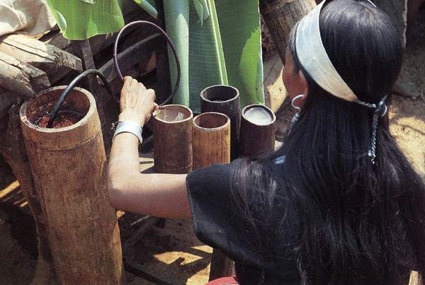 佤族普遍喜飲酒,喝苦茶。所飲用的酒都是自家釀制的“泡水酒”。常飲泡水酒不但于身體無害,反而有益健康。飲水酒成為佤族日常生活中主要的嗜好之一。喝酒時必須要請親友來家中共飲,主人給客人敬酒有一套規矩:必須一一敬酒。敬酒時,雙手捧竹酒筒,走到客人面前,弓身把酒筒從自己胸前按下再向上舉到客人嘴邊,主人喝一口,最后敬給客人喝干。如此一一敬酒,直至敬完所有在場的人,漏敬一個,都會被認為是不合“阿佤理”的。敬酒時,第一個被敬酒的人,通常是在場的客人中最被尊重的人。他接過酒后,先要用右手沾出幾滴,滴在地上,并口念祝福的語言,表示敬主人的祖先(圖為用竹筒制水酒,劉軍攝)。