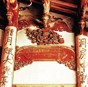 畬族的古老民居都是深宅大院,堂屋高大、寬敞,也是裝飾的重點,神龕、窗欞都有鏤空木雕和浮雕裝飾。堂屋依木柱用木板隔間,板壁上露出半圓的木柱,在對應(yīng)的木柱上貼著紅紙濃墨的對聯(lián)——每逢新婚、祝壽、春節(jié)等重大節(jié)慶都要貼對聯(lián)。