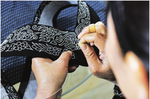 第四步是刺繡,包括三個環節,即固定框架圖案、填芯和鑲邊。固定框架圖案,即用一根大針將馬尾線穿好,再用另一根稍小的針穿上同色絲線,然后一邊用馬尾線在布面上鑲成各種圖案,一邊用穿有絲線的小針將圖案固定在布面上。填芯,即用各色絲線將固定好的圖案空隙部分填滿。鑲邊,即用橙色和黑綠色絲線在四周挑繡成鑲邊圖案。