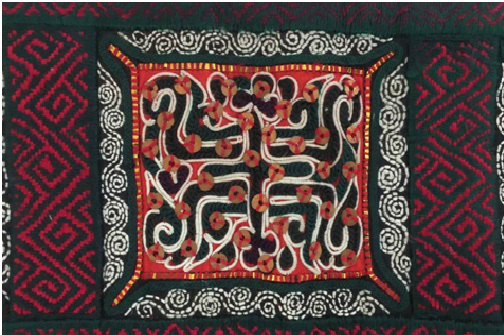而在背兒帶下部的中心圖案則是一個古老的傳統紋樣。主體形象以同心圓為主,里面的幾何裝飾圖案依次向外擴散,就像太陽的光芒一樣向四周散射。圓是一個太陽,里面有一棵樹,即小孩的生命樹,寓意生命之樹長青,樹上有一顆石榴花,寓意多子。太陽周圍彩帶狀紋樣代表雷鳴與閃電。雷神的地位在水族社會中是至高無上的,能主持正義、懲惡揚善。背兒帶上繡雷鳴便是祈求雷神對幼兒的庇佑。太陽紋與雷神的象征圖案組合,是水族自然神崇拜信仰的寫照。太陽圖案上下繡有兩只大蝴蝶,左右各繡一只老鷹。下部的四角是葫蘆紋,葫蘆的形象源于水族的創世神話。天地初始之時洪水泛濫,作為水族先人的兄妹二人為了躲避洪水,棲身于一支大葫蘆中,直至洪水退去。兄妹二人走出葫蘆,結為夫妻,繁衍生息,才有了今日成千上萬的水族兒女。于是,葫蘆被賦予了繁衍、生殖的意義。