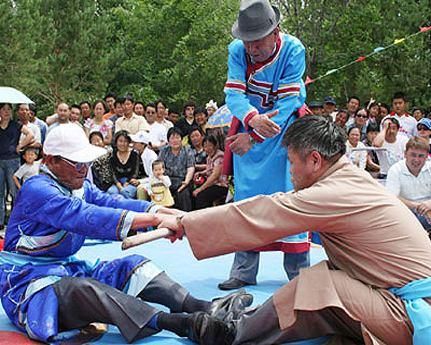 “扳棍”也是達斡爾族的一項傳統體育競賽。據說,扳棍的形成已經有近千年的歷史,由于扳棍比賽對場地、器材的要求極低,因此在達斡爾族的傳統節日如阿涅節或抹黑節上,都會看到達斡爾人在舉行扳棍這場體育比賽。
