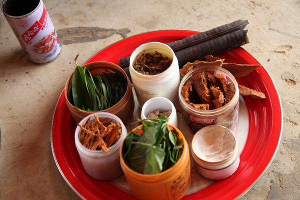 包燒鮮魚:布朗族的一道特色菜,原料主要是小魚、辣椒粉、姜蒜、野茶椒粉、芫荽等。制作時,先把魚剖開、洗凈,將各種佐料切細拌勻后填入魚腹內,在魚身上抹少許食鹽,再用鮮芭蕉葉包裹嚴實,用竹筒捆扎成包,放在火塘內的炭火下面焐燒,燒熟即可食用,鮮香俱備,味美可口。