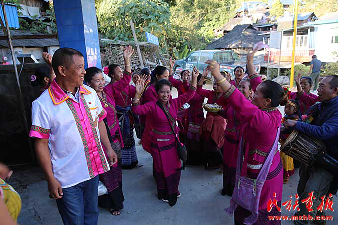 “今天是好日子,是個吉祥的日子,感動天、感動地,所有的布朗族兄弟,我們歡樂來相聚。”布朗族彈唱省級傳承人玉坎拉和村民一起唱了起來。
