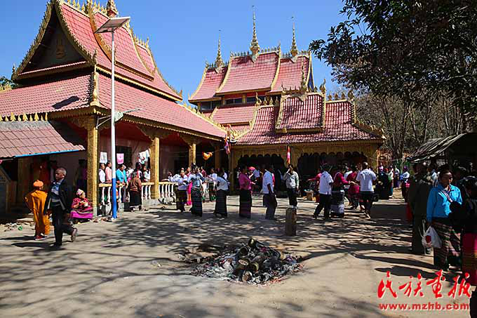 生活在我國西南邊疆的布朗族節日期間要舉行很多文化活動,布朗族同胞與親朋好友相聚一堂,品嘗美味佳肴并舉行歌舞表演。臨近中午,位于曼夕村前山頂的寺廟已人頭涌動,院子里人們圍成圈邊打鼓邊跳舞,緩緩移動的優美舞姿成為一道靚麗的風景。