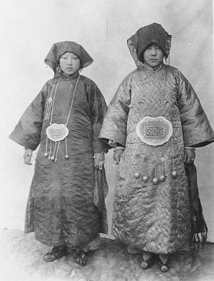 這是美國傳教士畢敬士影集中收錄的卡特·霍頓拍攝的又一張和撒拉族新娘有關的照片,此片也攝于青海循化。照片中的兩位撒拉族姑娘穿著鮮艷漂亮的衣服和翹尖的繡花鞋,佩戴著銀制的胸飾、墜子、項鏈、耳環和頭飾等。