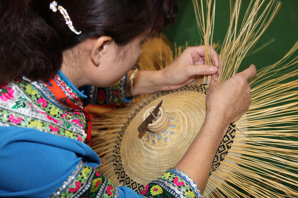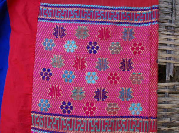 三角鉤鋤是毛南族特有的生產工具,毛南語叫“拱”。它小巧輕便,適合在雞窩地里中耕鋤草,又用于點種黃豆。種黃豆還有一種木制的“點穴錘”,用8寸到1尺長的金剛木削成圓桿,形如搟面杖,中間插一木柄,手握木柄在泥土里一錘,就成一個如雞蛋形的坑,即可放入黃豆,蓋上草木灰。這種“點穴錘”一錘一穴,工效很高,是種黃豆的最佳農具。此外還有禾剪、割煙刀等(圖為毛南族織錦)。