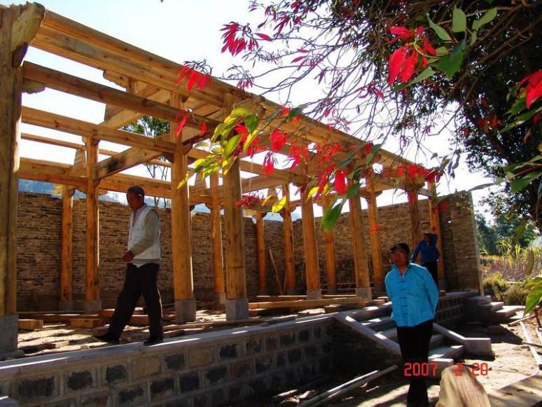 阿昌族建房傳統用工多是相互幫忙,全村協作,只吃飯而不付酬。建房一般分為“選材備料”“看風水擇房基”“動土奠基” “立柱成屋”等幾大程序。