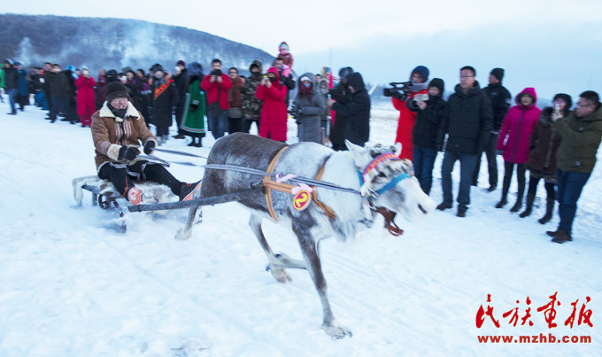 在呼倫貝爾冬季的冰雪風情節上,鄂溫克族的馴鹿拉著雪橇,吸引了許多游客的目光(武倩 攝影)