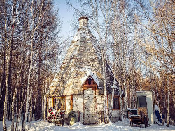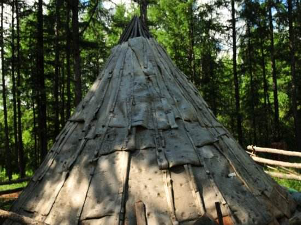 撮羅子的選址,是在地勢較高、陽光能照射到而且水和柴草就近可取的平坦之處。其蓋造方法,是用三五根約碗口粗細上有枝杈的木桿,相互交合搭成上聚下開的骨架,然后再用30根左右木桿搭在骨架之間捆綁固定,在南面(或東面)留出門,即基本成型。木桿搭起的只是“屋架”,外面還要覆蓋才能遮風擋雨。按照季節的不同,分別用樺樹皮、草簾子和犴、狍等獸皮,做成自上而下一層壓一層的圍子,綁在木桿上,門簾則夏用草或樹條編,冬用狍皮做成。
