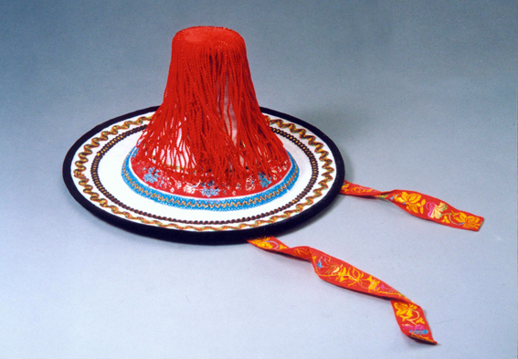 帽子是姑娘和已婚婦女的區別標志。姑娘不戴帽子,前額戴“沙日達什戈”。這是一條寬約三寸長約一尺,下邊緣用紅色或白色珊瑚小珠穿縫許多珠穗的紅色布帶。已婚婦女身穿高領偏襟長袍,一般由綢、緞、布、褐、皮料縫制。衣領高齊耳根,袍子一般以綠、藍色為主,但也有深紅、紫紅等顏色。袍子下擺兩邊開衩,衣袖口至肘部用各色織錦緞、彩綢、彩緞花邊一圈圈縫綴裝飾。腰系腰帶(裕固族也叫“胡兒”,即系腰),主要是桃紅色或綠色,長袍上面罩一件高領偏襟坎肩,但也有無領偏襟坎肩。