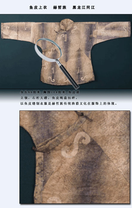 赫哲族的魚皮衣歷史久遠。我國古代文獻《山海經》第九卷《海外東經》中便有“玄股之國,在其(黑齒)北,其為人衣魚食鷗” 的記載。“衣魚”西晉學者郭璞解釋為“以魚皮為衣也。”說明早在兩千多年前,赫哲族的先民就已使用魚皮做衣服了。另據密山新開流新石器時代遺址中出土的魚叉及骨針,證明赫哲族的先民捕魚和縫制魚皮衣有數千年歷史了。清代張晉彥的《寧古塔山水記》有:“魚皮部落,食魚為生,不種五谷,以魚皮為衣,暖如牛皮”的記載。《皇清職貢圖》記載:“赫哲衣服多用魚皮而緣以色布,邊綴銅鈴,亦與鎧甲相似。”另外,地方志書對此也多有記載。可見,赫哲族制作和穿著魚皮衣是真實而久遠的。