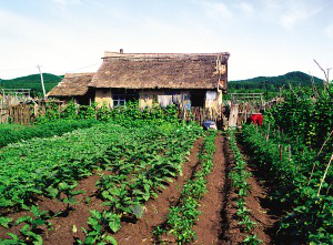 赫哲族人多用鍬把粗的柞木夾成障子,形成院落。房屋前面留塊院子,養雞、豬,放醬缸、農具,碼著成排的木柈子垛;房后的菜園子較大,種些架豆角、黃瓜、茄子、小蔥、辣椒、西紅柿等蔬菜。黑龍江同江市街津口村的街道東西走向,道南的房子從后面開門繞過山墻進院,菜園子在前院;道北的房子從前門穿過菜園子邊的巷道到前院再進屋。