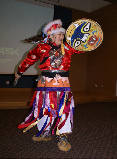 鼓是一種十分古老的打擊樂器,制作簡單,使用范圍廣,因此在赫哲族中非常流行。民族學家凌純聲在20世紀30年代調查時發現,赫哲人幾乎家家有鼓。在當時,赫哲族使用的鼓,可以大致地分為三類:薩滿用的橢圓形鼓、“阿哈瑪法”用的圓形鼓和普通人家用的鼓。前兩種鼓均為單面鼓,雖然其大小略有不同,而其用法大致相同,即主要用于宗教活動和民間祭祀。這兩種鼓既是薩滿的法器,又可以當樂器使用。無論是在薩滿跳神之時,還是在每年的鹿神節之際,薩滿鼓都是為人們伴舞的主要樂器。普通人家的鼓比薩滿鼓小得多。
