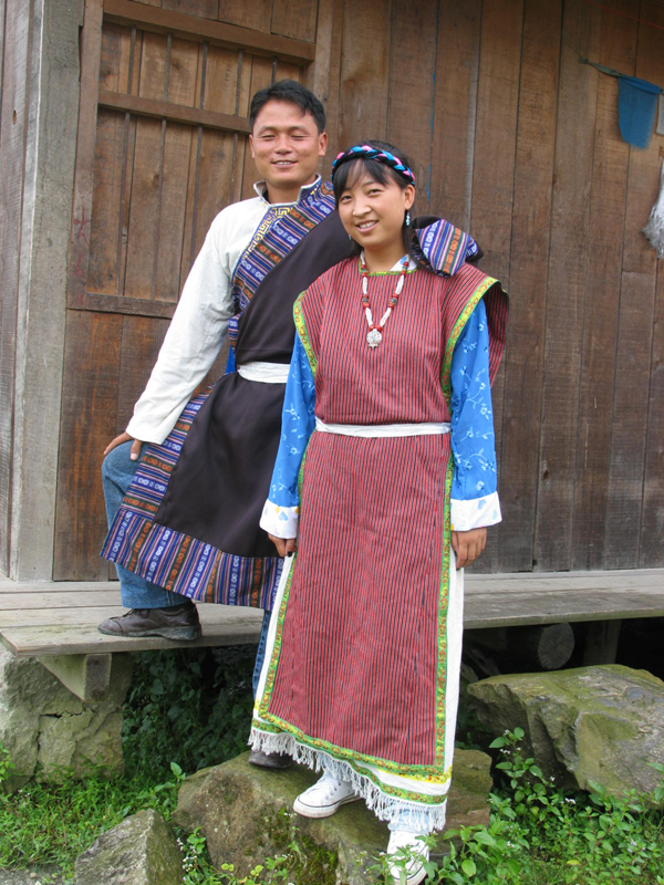 門隅地區(qū)的男女都喜愛用羊毛織品氆氌為原料,穿氆氌袍和絳紅色的長袍,腰間系一條赭色腰帶;女子內(nèi)衣以棉織和蠶織品做原料,顏色絢麗多樣,無開襟、無領(lǐng)、無扣子,只開一個(gè)圓口或三角口由頭套穿。外加長袍及上身穿黑氆氌做的“熱故”(門巴語,留有邊子的短服),下身腰部圍一塊白氆氌做的“吉瑪”(門巴語,圍裙)圍裙,并在圍裙右下角綴有“雍仲”(藏語,意為堅(jiān)固、永固。原始宗教苯教奉為神秘字,并以左旋逆時(shí)針方向之形字紋作為代表)吉祥圖案,有的繡有“日月吉祥”圖案。