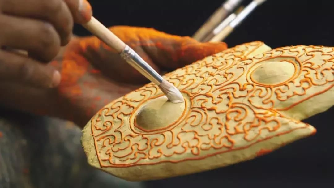在等待膠布面具晾干的時候,扎西去到了兒子練習跳舞的地方,在外面遠遠的看著兒子練舞。原本希望兒子繼承他這手藝的心思,在看到兒子真心喜歡藏舞后,也被漸漸放了下來?;氐郊抑?,膠布面具已經干透,開始了制作面具中最重要的一環:上顏色。隨后上頭發、簪子等小零件,一個薩迦面具終于制作完成。