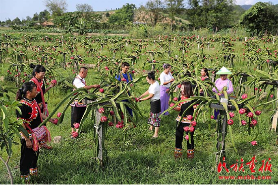 大荒田村黨總支認真貫徹習近平總書記“望得見山,看得見水,記得住鄉愁”的講話精神,以綠水青山為形,以鄉愁鄉韻為魂,因地制宜繪制和制定了“兩圖一書一表一民約”,提出了“八寨共建、五園同創,推進產旅融合田園綜合體”的發展思路,構建起有民族特色、有民族溫度、有民族感情、各民族認同、可實施的發展藍圖。以實現各民族增收致富為目標,扶持壯大民族地區特色優勢產業,按“宜農則農、宜工則工、宜商則商、宜游則游”方式,以合作社為引領,圍繞“一村一品”,組建高原紅果蔬種植專業合作社,采取“黨總支+企業+合作社+基地+種植戶”的模式,注冊“來冷紅”品牌,采取“五統一”的模式,推進以火龍果為主的水果種植業規模化種植、標準化管理、訂單化銷售。