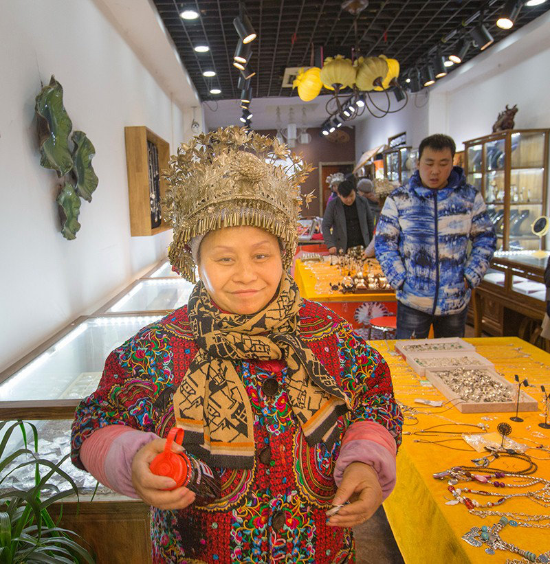 “苗奶奶”楊玉芬,苗族,今年54歲,貴州凱里人,玉芬民族工藝品有限公司總經理,第一個在西安回民街做銀飾生意的南方人。當有人問她貴州和西安哪個更好時,她總是用一句話來打發:“都好,我就是像(西安)本地人啊?!?/p>