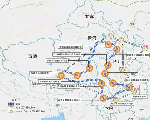 藏羌彝文化產業走廊依托的城市樞紐包括:四川省成都市、貴州省貴陽市、云南省昆明市、西藏自治區拉薩市、陜西省西安市、甘肅省蘭州市和青海省西寧市。