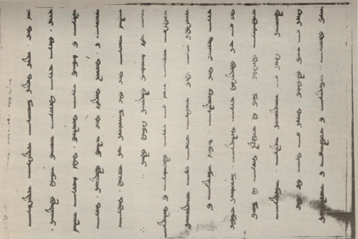 從吐魯番出土的《亞歷山大傳奇》蒙古文抄本殘卷也屬于元代。屬于明代的寫本有景泰年間朱祁鈺頒發的敕諭、萬歷年間蒙古俺答汗呈朱翊鈞的貢馬表以及四夷館抄錄的《華夷譯語》韃靼館雜字和《高昌館課》中的一些敕諭和奏章。元定宗貴由汗的御璽已失傳,但其印文保存在梵蒂岡檔案館收藏的一封外文信件上。印文為回鶻式蒙古文、雙鉤體、筆勢古拙遒勁。在俄國第聶伯河畔出土的銀質長牌,鐫有窩闊臺系王子俺都剌的令旨,是一件回鶻式蒙古文符牌。