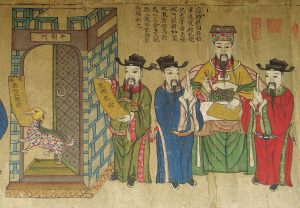與畬族有關(guān)的圖畫主要包括清朝乾隆年間皇家繪制的《皇清職貢圖》,畫內(nèi)有相關(guān)的畬族資料和家族祖圖。今藏的祖圖多為清代物品,以麻布、土布為底,平圖勾勒,濃墨重彩,以條狀橫幅長卷居多,也有直幅多屏組合而成的。畫面配有文字說明,圖文并茂,展示了畬族的歷史發(fā)展、社會生產(chǎn)、文化習(xí)俗等。畬民家族祖圖分布范圍較廣,主要在福建、浙江、廣東等省。