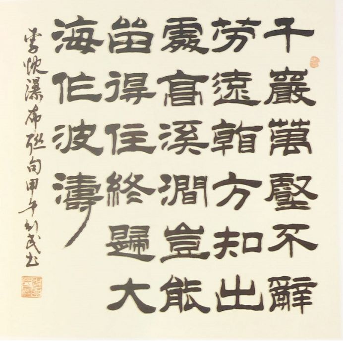 張行民的書法作品博覽眾家之長,悉心揣摩隸書之要義,領悟其精髓,加入其心志與感悟,漸漸形成了自己的風格。他的作品灑脫飄逸,體骨厚重,參合有各派書體的筆意,同時又有自己個性和意境的張揚,字體端莊英武,體象收放凝度。賞其書法,總能給我們一種“渾然陣列,筋道玉骨”的美感,實屬不可多得。