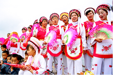 以大理市為主要代表的洱濱區白族服飾。如周城、喜洲、挖色等白族服飾,他們世代伴水而居,生活環境十分優越,服飾給人一種清新明快的感覺。在很大程度上折射出這種環境的優越性,周城村白族男服飾過去的穿著較為復雜,纏白布包頭,上衣穿立領對襟布紐衣,俗稱“三滴水”,最里的一件穿白色、中間一件穿藍色、最外一件穿黑色或是藏青色的外衣,三件衣服都是敞開著,露出內穿的兜肚,外穿一件麂皮或山羊皮的領褂,下穿白或藍色大襠褲,腳穿布底剪口鞋。肩掛繡花掛包。而現在的男裝基本與漢族相同,平時需要穿戴的民族服裝也是改良過較為簡潔的男裝,只有在重大節日的時候才能看到傳統的著裝風采。而女裝的穿戴至今還保持得較為完整,以白、藍兩色為主,沿承了白族崇尚白色的傳統特點,上身穿白色緊袖裳,外套紅或藍色右衽領褂,在領褂的紐扣上掛三須或五須銀鏈,銀鏈上綴掛件,有銀質的針筒、魚、牙簽、耳勺。手戴金、銀或玉手鐲、戒指。耳戴金、銀耳墜。手袖上套滾邊的大袖小袖,并在袖上鑲各式花邊。腰系繡花短圍裙或系凈白色底外鑲一圈黑色邊的素面短圍腰。下穿白或藍色滾邊長褲,褲腿邊鑲寬窄花邊,花邊上面繡各類花卉圖案。腳穿繡花尖鞋,又名“白姐鞋”(“柏姐鞋”),鞋面為紅、粉、綠、黑等色,繡有艷麗的花紋。頭飾和過去的頭飾相比較從美術的角度上看要美得多,特別是姑娘的頭飾,過去傳統頭飾一般喜戴魚尾帽,還有我們在電影《五朵金花》中所看到過的姑娘頭飾,而今姑娘的頭飾讓人一看就聯想到大理的“風花雪月”四大美景。頭戴色彩鮮艷的繡花頭巾,繡花頭帕上端精心梳理出茂密雪白的絨毛,形象的表現了蒼山頂上的皚皚白雪,將發辮盤繡花頭帕外,纏以大紅絨線,形如滿月,一側垂下雪白的纓穗飄飄灑灑,象征著終年吹拂的下關風。整套服飾在很大程度上折射出這種環境的優越性,如色彩搭配對比鮮明,簡潔明快,挑花精美,毫無細碎之感,裝飾繁而不俗等。