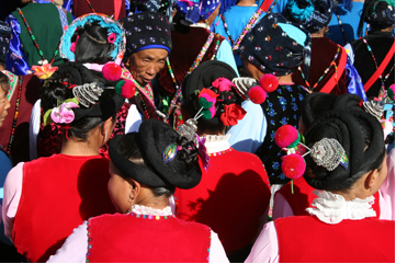 新娘的首飾主要由耳環、銀鐲、針筒銀鏈和戒指等構成,其中銀質手鐲和針筒銀鏈大都出自本地工匠之手。主要是因為在鶴慶以北的新華村早就是聞明世界的制銀之鄉,銀手鐲一般分為“細絲”、“粗絲”和“粗夾細”三種。細絲就是用較細的銀絲(直徑0.1厘米)制作成直徑為l.5厘米的繩狀手鐲;粗絲則用0.2厘米銀絲做成;粗夾細是用上述兩種銀絲混合制做而成的。銀手鐲式樣的選擇取決于新娘的喜歡。而針筒銀鏈長40厘米,它是由l2條銀鏈排列組合,在銀鏈的中段有“石鎖”狀的飾物連接下部,銀鏈下端綴有栩栩如生的十二生肖屬相,針筒銀鏈掛在胸的左前側,但也有掛紅色或綠色方巾的,即實用,又能起裝飾作用。耳環、戒指和玉鐲等其它飾件一般由自己準備,但也有親友贈送的或是由婆家送的。整套服飾有容華貴,明快之中顯素雅,繡艷之中見端莊。