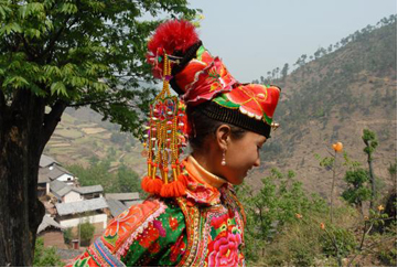 云南巍山彝族回族自治縣各民族如壯麗的織錦,將生活裝扮得五彩繽紛,充滿詩情畫意。其中特別是東山一帶的彝族服飾色彩較為豐富,款式變化多姿,并且以大量的銀制品和刺繡裝飾,制作工藝之精良,堪稱少數民族服飾一絕。以小孩帽而言,就有魚尾帽、小瓢帽、銀鼓帽、花帽和搭耳帽等數十種,名目繁多,式樣各異。帽子上都繡有花草、樹葉、龍鳳圖案,鑲嵌著閃亮的銀首飾,十分逗人喜愛。小孩的衣服式樣也很多,大多由紅、藍、綠、白幾種顏色的布料縫制而成,紅綠交織,藍白相襯,非常艷麗。如花朵一般的彝族少女通常頭戴銀鼓帽,墜耳環、身穿藍領褂,腰系花圍裙,下著綠彩褲,背掛圓裹背。銀鼓帽和繡花鞋做工極為精巧,全套裝飾花團錦簇,恰似一只開屏的孔雀。結婚后的婦女就不再戴帽子,改為結發髻,裹包頭。發髻一般呈寶塔狀,外裹黑紗和黑布包頭,發髻上戴“別子”。“別子”其實就是發卡,均為銀制品,分為四串,每串有兩個燈籠繡球,兩個響鈴和兩尾小魚。包頭巾外再用銀串珠、亮球飾之。上衣著右衽大襟,前短后長、領、袖及襟邊則鑲以多層不同的金銀絲瓣或自繡花紋的多層寬窄不同的花邊。外罩齊腰藍布短領褂,領口上安裝著七個用銀鼓釘湊成五個葉子,狀如葵花形,彝語叫“披巴”的裝飾。領褂四周皆用銀鼓釘鑲邊,共四排,每排36顆。一件領褂上需有兩百多顆銀鼓釘,加上胸前佩戴銀制的“三須”針筒,“菱角吊”串珠和雞心型繡花荷包,整個裝飾真是銀裝素裹,分外嬌嬈。腰間系的圍腰布上,鑲嵌多層金銀絲瓣或自繡圖案的花邊。圖案有串枝蓮、牡丹花、太陽花及鳳戲牡丹、丹鳳朝陽等。無論未婚和已婚婦女,背上都有一個用羊毛搟制而成的圓型繡花裹背,直徑約一尺不等,內外兩層,中可承物,上繡兩對太陽花,一大一小,對稱排列。裹背除用作裝飾外,還可保護腰部,既有欣賞價值,又有實用價值,這在巍山彝族服飾中是最為典型的一件飾物。銀鼓帽繡有42朵小花,鑲有96顆銀鼓釘,帽頂插有花一朵或釘有櫻花一束。其帽形如金魚,魚頭魚身為帽,魚尾多岔分為護頸,亦稱為“魚尾帽”。繡花鞋呈船形或鳳頭形,鞋面繡有40余朵小花,紅色中夾有40余片綠葉。如果是新娘鞋,則用紅色或粉色的軟鍛做鞋面,更為講究。