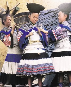 要論“疊穿”的數量之最,則當屬貴州大方縣顯母村的苗族女性了。與苗族慣用銀飾的固有印象不同,這里的苗族女性鮮以銀為飾,她們用數量極為可觀的服飾“疊穿”來彰顯富裕。節日里,顯母村的苗族女性換上盛裝——數條百褶裙系在腰間,塑造出豐腴的臀部造型,內層裙子素凈無花,外層裙子則布滿條帶狀蠟染裝飾。在這個難得的大型社交場合,未婚女孩通過“疊穿”后的獨特造型來展示自己的魅力,衣物的數量和精致程度成為了吸引異性、獲得肯定的重要標準和獲得美好婚姻的重要條件。到了婚禮時,女性所著裙子的數量更是可達35條。婚后,她們要在裙邊加上一圈深色邊飾以作標識。