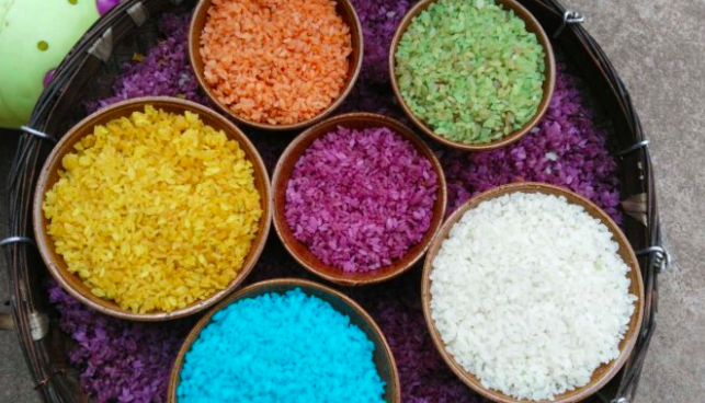 花糯米飯是先用各種植物的根、莖、葉、花經(jīng)石臼沖搗細碎后,用水浸泡或煮沸一定時間,成為不同顏色的汁液。再用這些汁液分別浸泡淘洗干凈的糯米,使其著色,蒸熟后即成不同顏色的糯米飯。其色彩有黑、紅、黃、綠、紫、白(大米本色)等六七種。一般取五色為多。