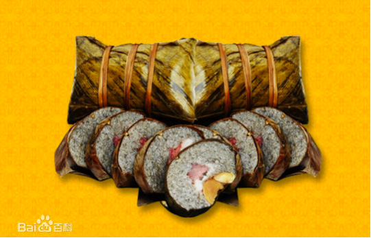 一種是云南文山壯族苗族自治州的馬腳桿棕。這種粽粑是用30厘米長、10至15厘米寬的大粽葉包成。其形狀頭大,有一長尾,很像一根帶蹄的馬腳,故稱馬腳桿粽。包粽時,將糯米淘洗后浸泡半個小時以上,把頭年的干粽葉燒成草灰,與濾干的糯米混合均勻。火腿切絲、拌合棗子、化油,再與拌了粽葉灰的糯米均勻拌和,外包鮮粽葉,入鍋水煮而成。其味分淡、咸兩種。咸味添加食鹽,淡味則不加鹽。也有加糖而成甜味的。馬腳桿粽色灰黃、味香,口感滑膩。可熱食,也可冷食,保存期較長,是節(jié)日必備之品,也是青年男女趕集、趕歌圩,趕花街互相贈送的常備禮品。