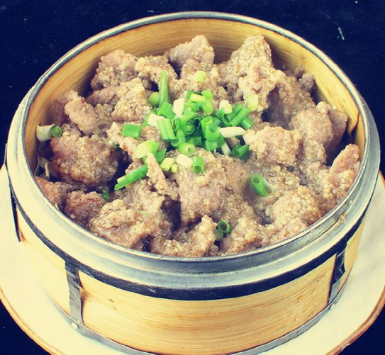 粉蒸肉以肉為主料,采用米粉和其他調味料制作而成。粉蒸肉糯而清香,酥而爽口,有牛肉、排骨、豬舌、牛肚、肥腸、羊肉等不同選擇,味道也根據個人喜好在辣椒碟中添加醋、糖、麻油等調味料,粉蒸肉味道鮮美、口感松軟、回味無窮。