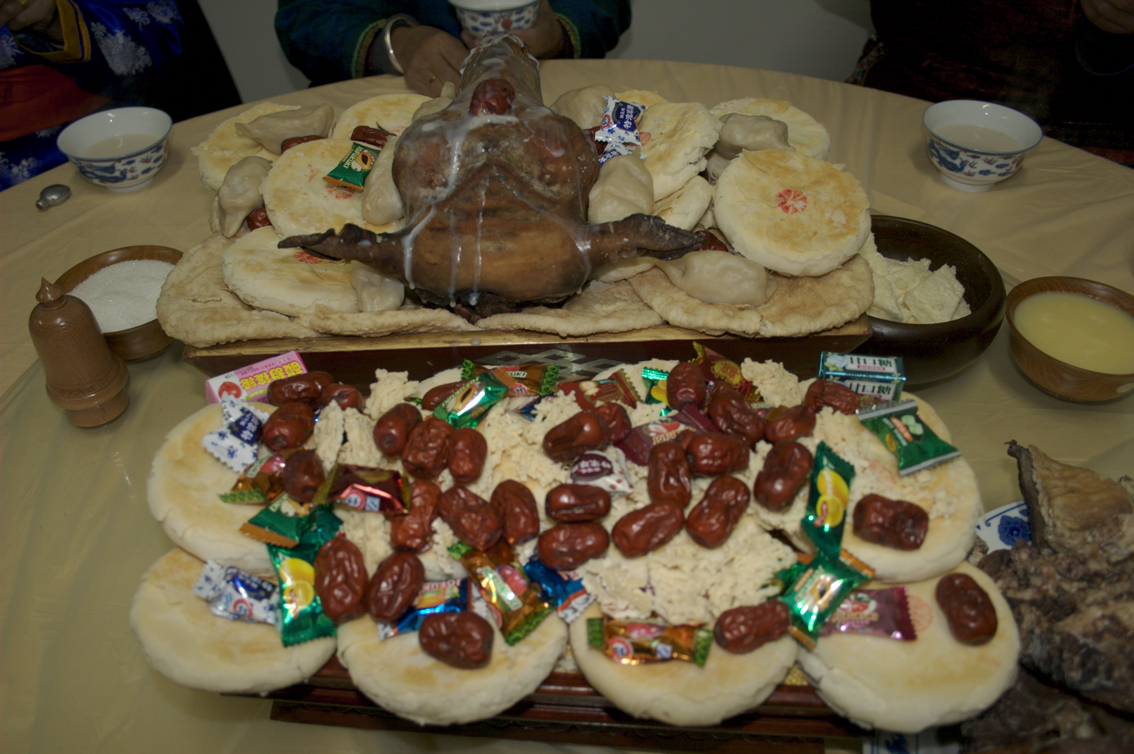 全羊席,又稱整羊席(蒙古語為“布禾勒”或“酥斯”),是蒙古人招待貴賓的傳統佳肴,也是蒙古民族最古老、最隆重的一道宴席,一般只在盛大宴會、隆重集會、舉行婚禮或接待高級貴賓時擺設。將整羊加工后擺在長方形的大木盤里,像一只臥著的羊,肉味鮮美,香飄滿堂。賓客在進餐前,還要舉行一定的儀式,高唱贊歌,朗誦獻整羊祝詞等。據文獻記載,成吉思汗曾設過全羊宴。忽必烈登基時,也設全羊宴祭神祇、待賓客。至清代全羊宴更加盛行,現已成為蒙古民族風格接待貴賓的名貴菜肴,馳名中外。