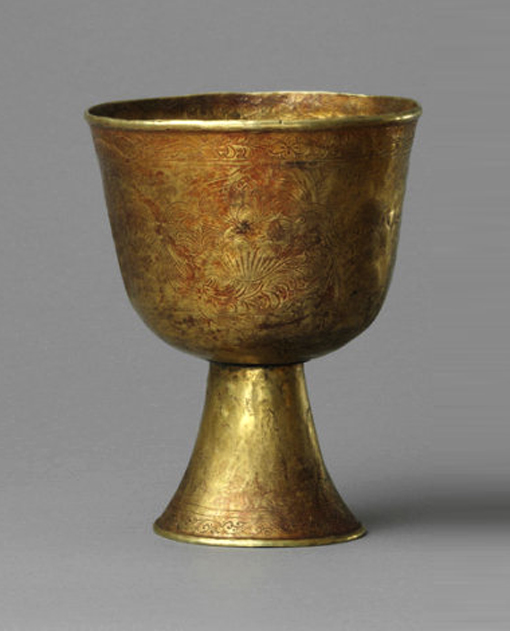【圖為元代金質鏨刻蓮花紋高足杯,內蒙古自治區博物館藏】