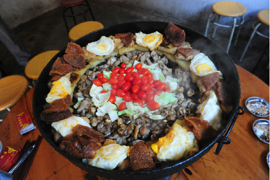 平壩凹鍋更具特色,食材十分豐富,為了拍攝平壩凹鍋小吃,我們一行來到當?shù)厝俗诎l(fā)英家開的勤發(fā)飯店,并被安排在二樓的里間。屋內(nèi)正中支著一口平底銅鍋,下面是燒著炭火的爐子。火很旺,不一會平底鍋里的油便嗞嗞作響,主人把煎得黃黃的臭豆腐、豌豆粉等放到鍋里,鍋的中間加上一些蔬菜、小個西紅柿,色彩非常漂亮,周圍都放著一碗碗用噴香的辣椒面拌有濕蘸水和干蘸水。