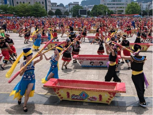 打榔舞,是崇左市天等縣的壯族傳統民俗舞蹈,用于酬神、還愿、祭祀、娛樂等活動,起源于唐代武德年間。打榔舞主要道具為木榔,音樂響起后,每人用一米多長的木杵有節奏的敲擊榔壁、榔底和榔邊,動作歡快有力,以此來表達壯族人民對五谷豐登、六畜興旺、幸福吉祥的祈求和渴望。表演者不分男女老少,有二人對打、四人對打、多人交錯對打等多種方式。
