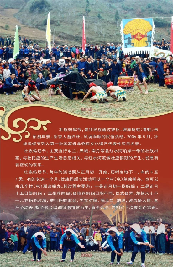 壯族螞拐節主要流行于廣西西北部紅水河流域境內,因壯族把青蛙稱“螞”而得名,又稱為"蛙婆節"、"青蛙節"。傳說掌管風雨的不是龍王,而是螞女神。紅水河沿岸壯族村寨通過祭祀螞,祈求風調雨順,五谷豐登,人畜興旺。所以,每當春節到來之時,這里的壯鄉村寨的人們便自發到螞亭(社亭)周圍舉行隆重熱烈的螞歌會。
