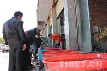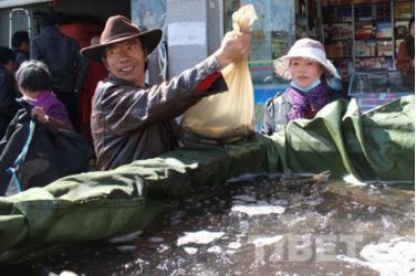 在當?shù)厮幫跎睫r(nóng)貿(mào)市場可以看到,很多信眾或帶著器皿或拿著塑料口袋前往水產(chǎn)店買魚放生。甚至有的信眾開著一輛面包車,車廂用塑料包裹,里面裝滿水,載著買來的一整車魚前往拉薩河放生。 “薩嘎達瓦節(jié)期間,魚賣的特別快,藏歷十五的時候我們的魚都被買光了。”水產(chǎn)市場的李老板說。