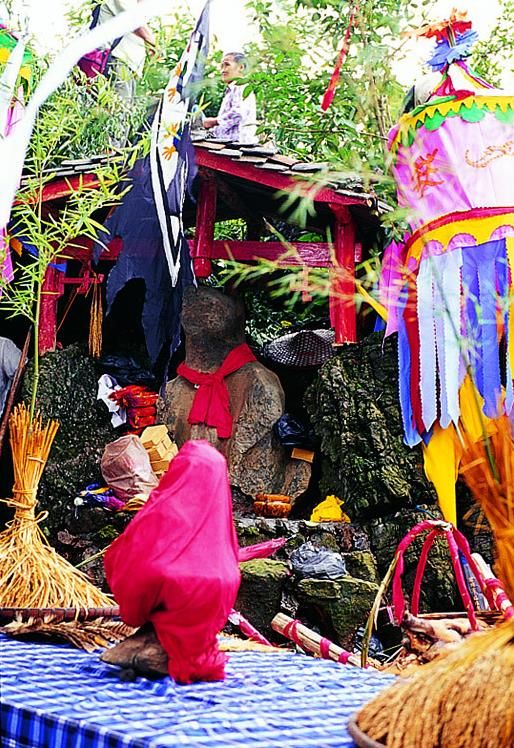 敬霞儀式在霞堂舉行。霞堂設(shè)有祭壇。壇前立著一根竹竿,竿頂上站立一只公雞。祭壇中是主祭席,其友有用松針鋪成十二個祭祀點,由宗族各支系擺設(shè)祭品。敬霞這天,各支系由德高望眾者領(lǐng)隊。抬著豬肉、糯米飯、米酒等食品列隊進(jìn)入霞堂。一路上銅鼓、銅鑼、欽、革鼓被敲得冬嚏冬嚓地響,人們跟在后面吆喝著前進(jìn)。祭典開始,鑼鼓暄天。接著由執(zhí)壇的水書先生念讀敬霞的祝詞,內(nèi)容多為祈福禳災(zāi),期冀風(fēng)調(diào)雨順,人壽年豐之類。祝詞之后便酪酒祭之:此后,由兩個身穿白衣的小伙子抬一母豬到田壩中繞行,后面那位不時用松針刺戳豬的尾部,使它發(fā)出嗥叫聲。圍觀的人常常發(fā)出哄笑,并且盡情地用竹片屏水和撮稀泥向抬豬者灑淋過去。走過霞堂之后,抬豬者丟下母豬,故意穿進(jìn)圍觀的人群,嚇得人們四處躲避。這種逗趣結(jié)束之后,水書先生再度念讀咒詞,當(dāng)他手中的執(zhí)法彩杖一揮時,飼雞者便學(xué)雞嗚,逗引竹竿頂上的公雞啼鳴。這時,主祭者就向眾人高呼:等待霞神降雨來沐浴。此后,水書先生再念祝詞,又酹酒祭之。然后由各族系代表抬著"酒壇去澆灌"霞神"。人們用酒從頭澆到腳,一直澆到"霞神"們倒(象征酒醉)才算祭祀的成功。
