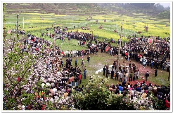 節日當天,一大清早,人們穿上節日的盛裝,翻山越嶺地從各條大路小路往坡會地匯集。山坡上、田垌里、公路邊到處擠滿了看熱鬧的人群。